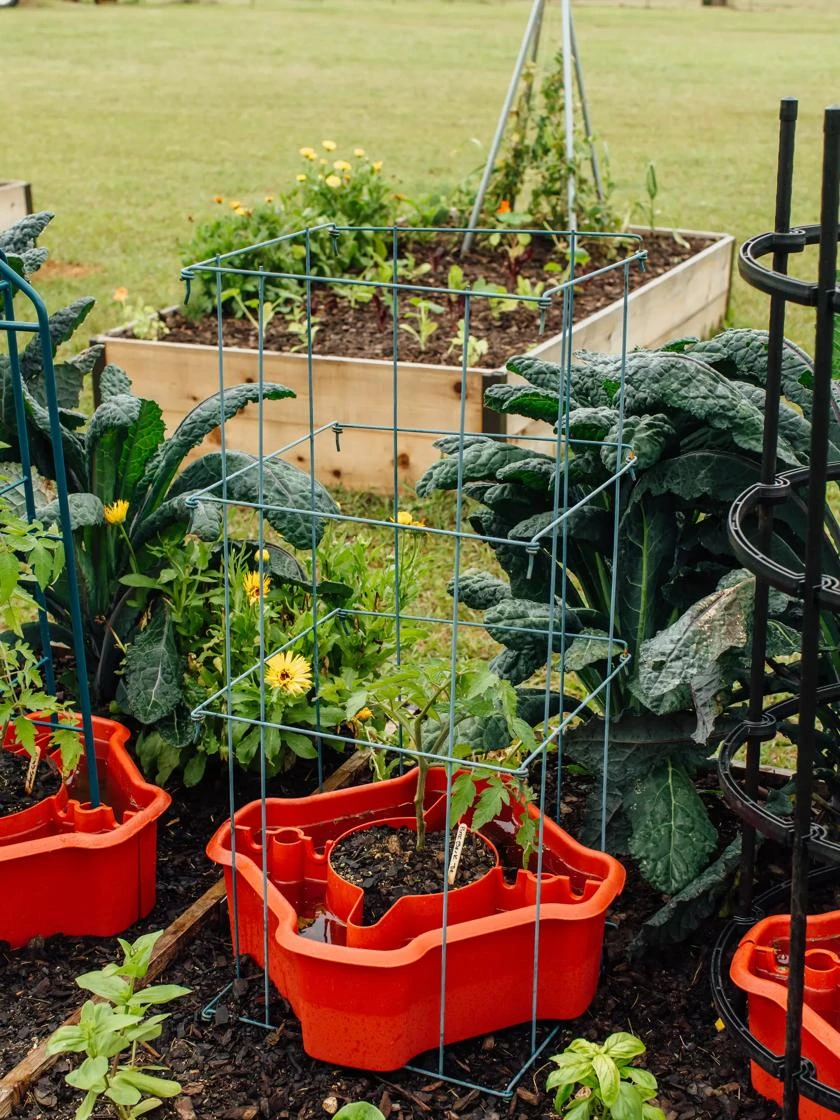 The two-piece design allows for use with a new or existing, already established plant. Higher walls protect stems, fend off cutworms, and discourage weeds. The base reservoir holds two gallons of water which releases water directly to the root zone. Tomatoes are notoriously thirsty plants so this feature is key!